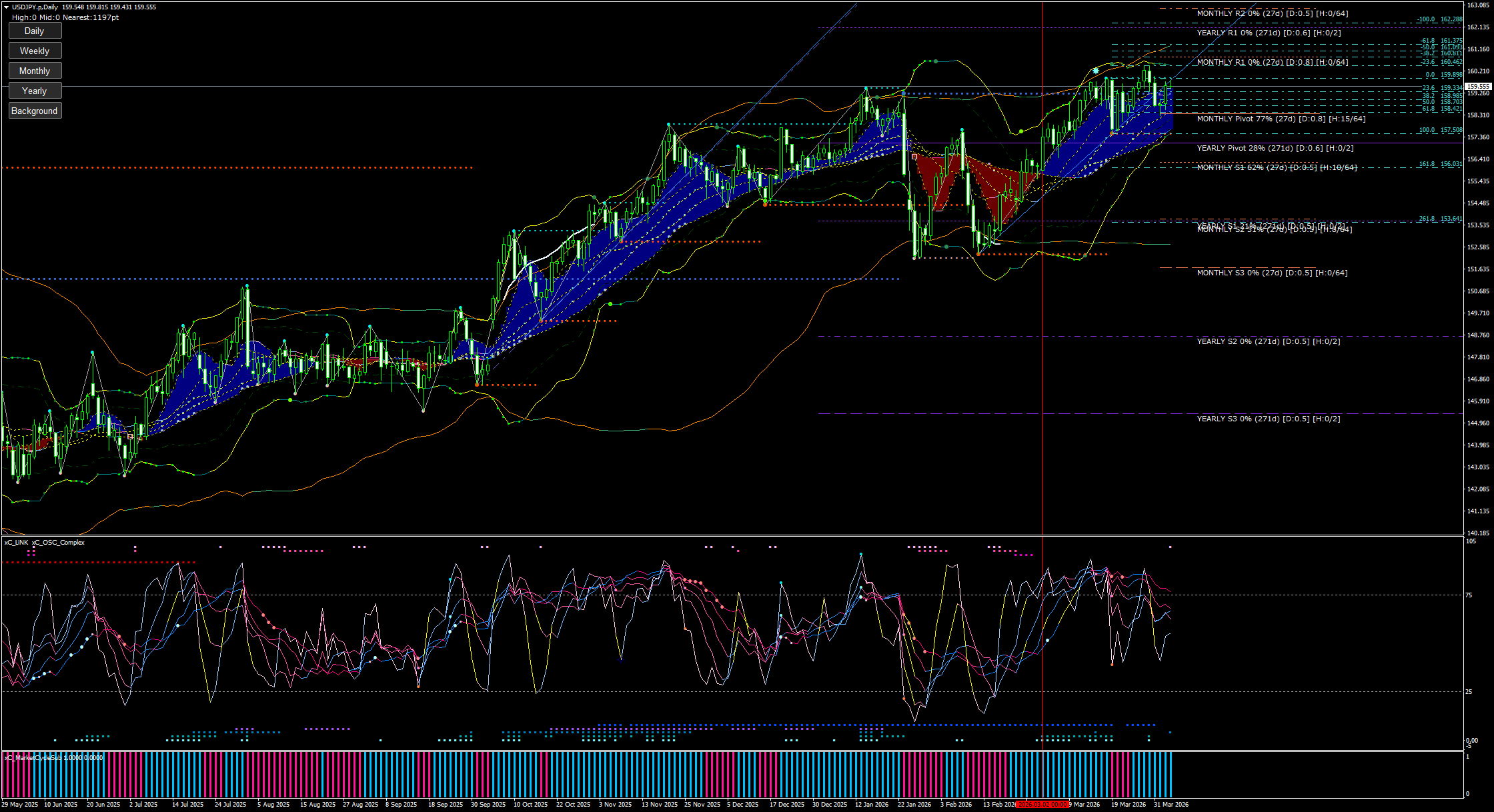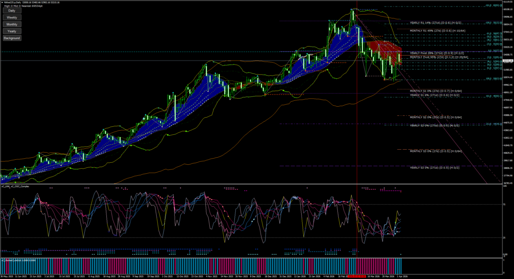 50,974円辺りの価格帯を割り込むとやや危険ラインでMonthly Pivotの49,000円を割り込むと下落トレンド入りと思われます。